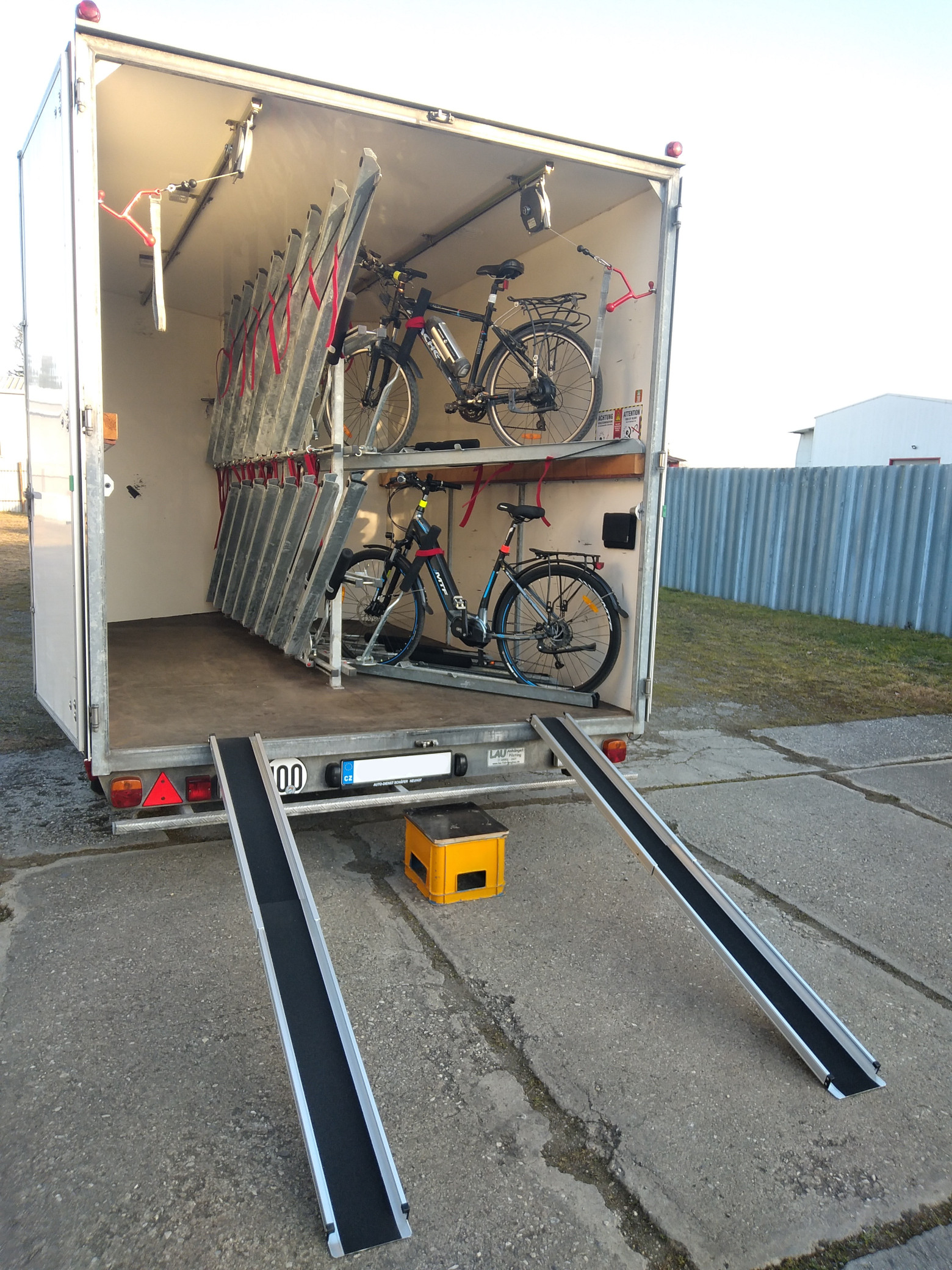 Tento vlek umožní bezpečnou přepravu až 32 kol nebo elektrokol všech typů. Přepravovat lze horská, trekingová, silniční kola nebo koloběžky.